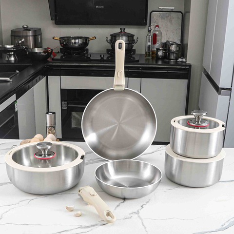 Set completo domestico pentole in acciaio inossidabile 316 sei pezzi staccabile manico non rivestito padella sostenibile in metallo Set da cucina